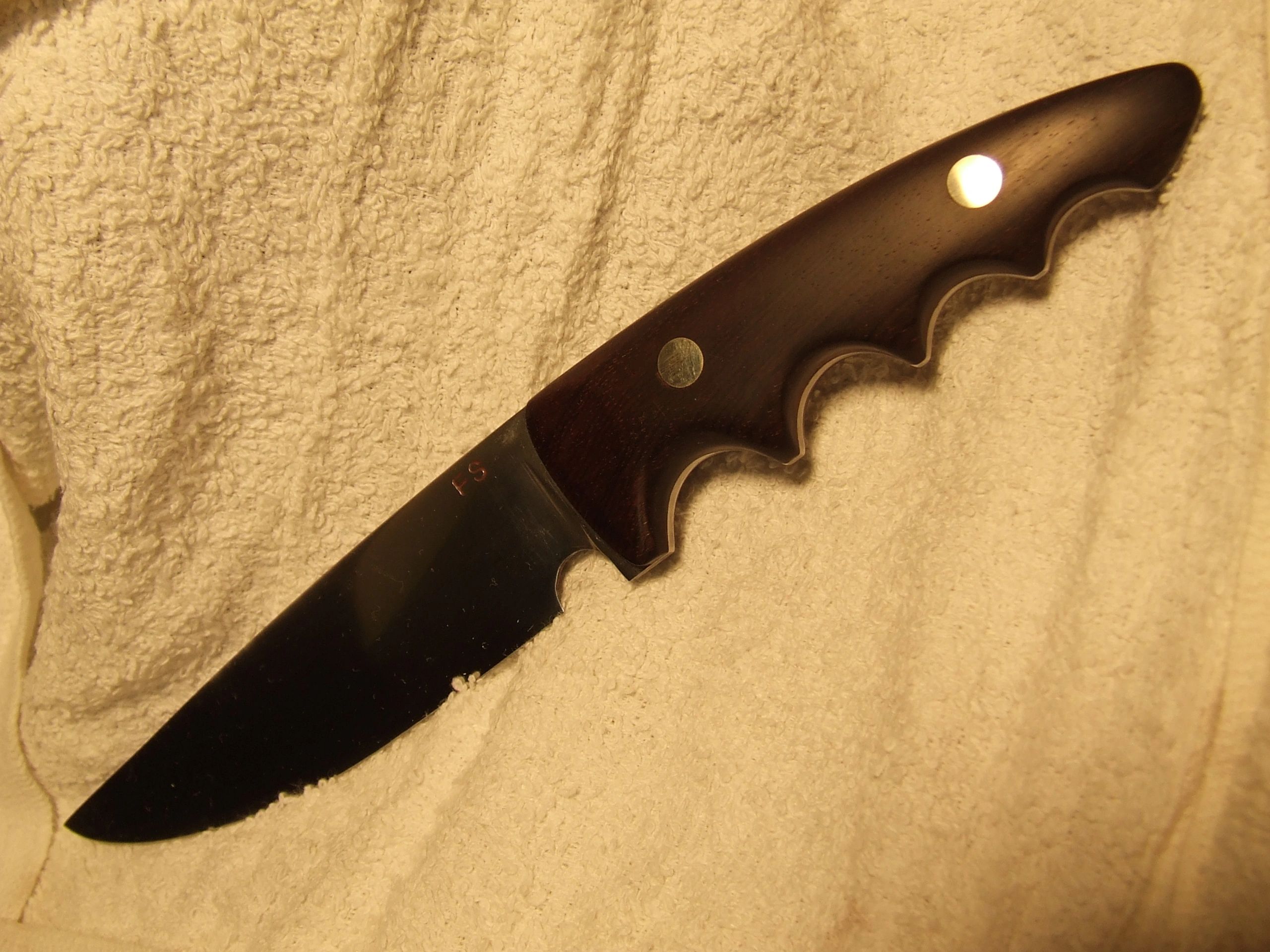 5" hunter, 1095 high carbon steel full tang, flatground with Rosewood grip scales and nickle silver cutler rivets. sold