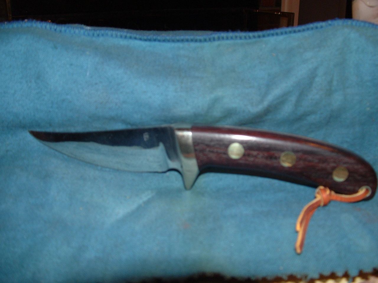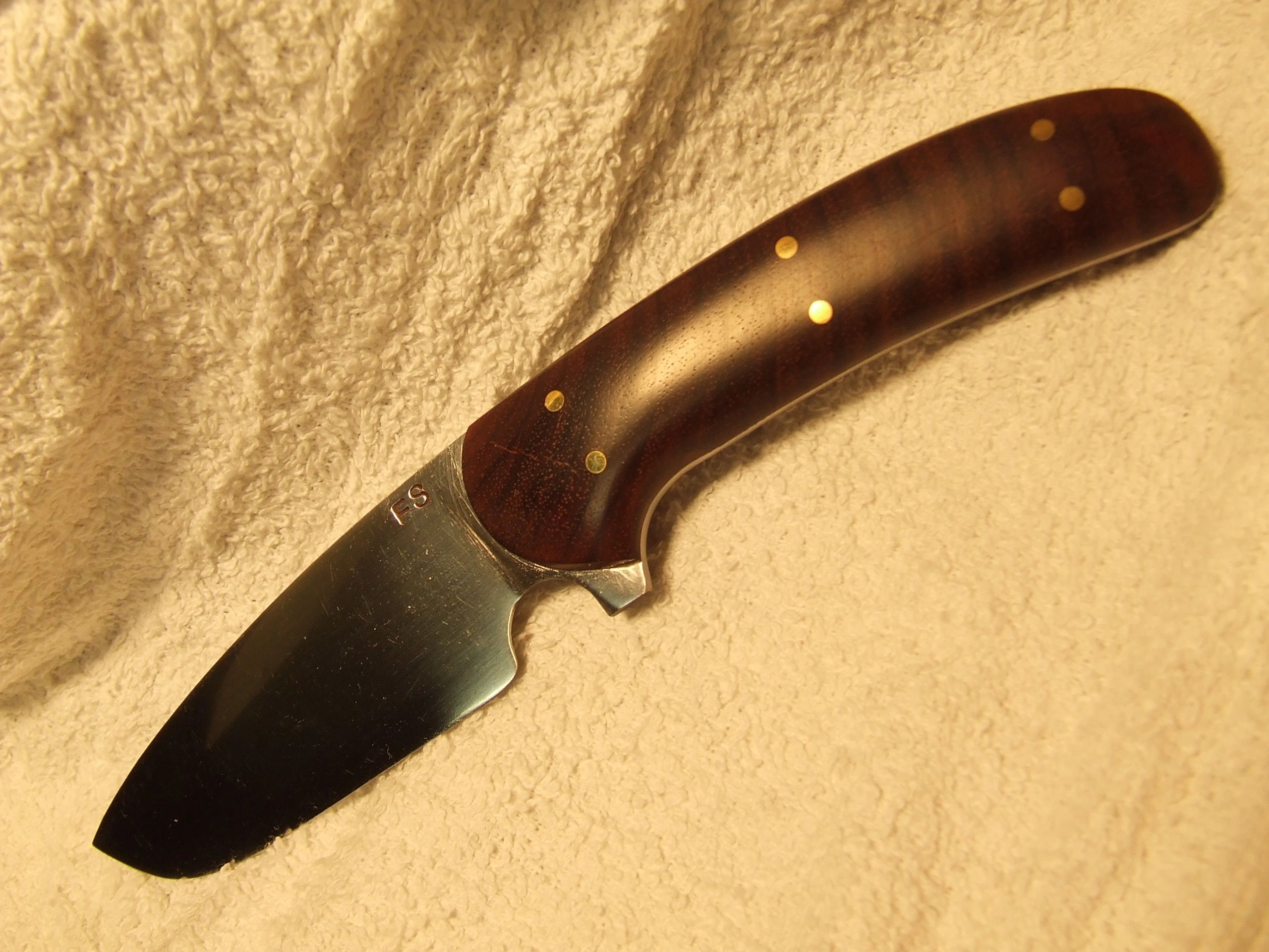 3 1/2" skinner/utility knife, 1095 high carbon steel full tang blade is flatground with quarter sawed Rosewood grip scales and 1/8" brass pins. Not available, being rehandled