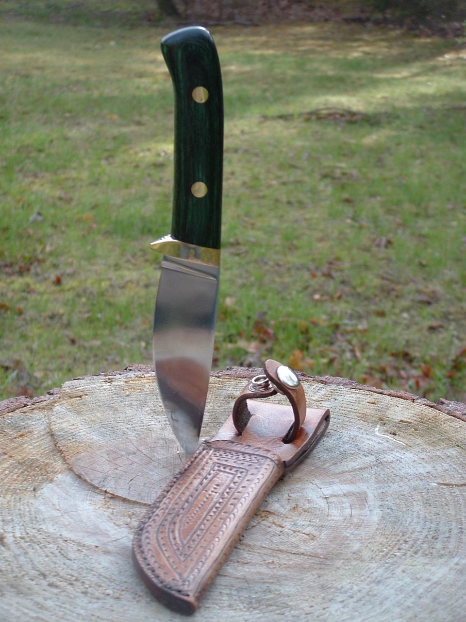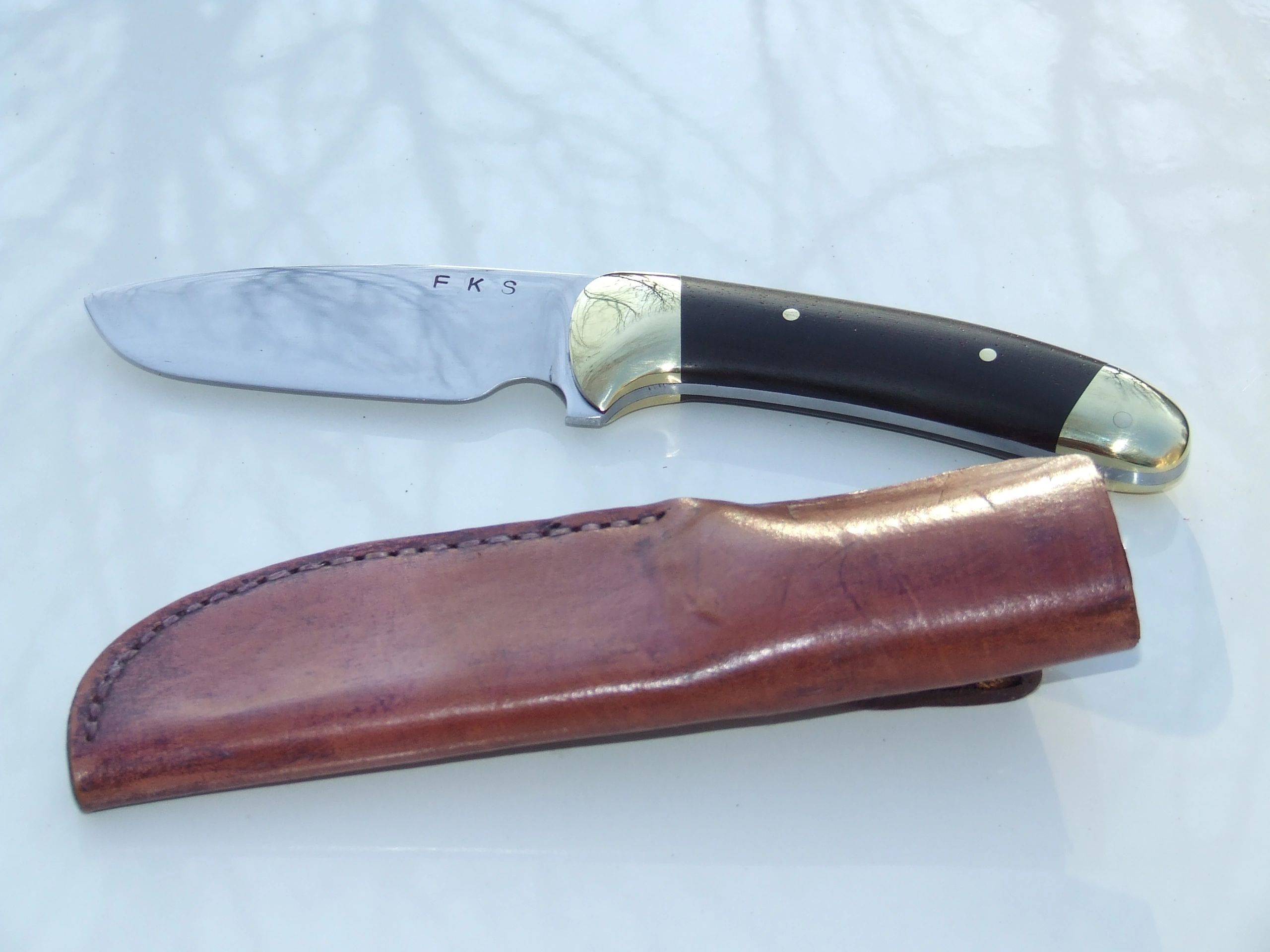 3" 1095 high carbon steel hunter, flatground with brass guard, cutler rivets and thong liner. SHOP SAMPLE