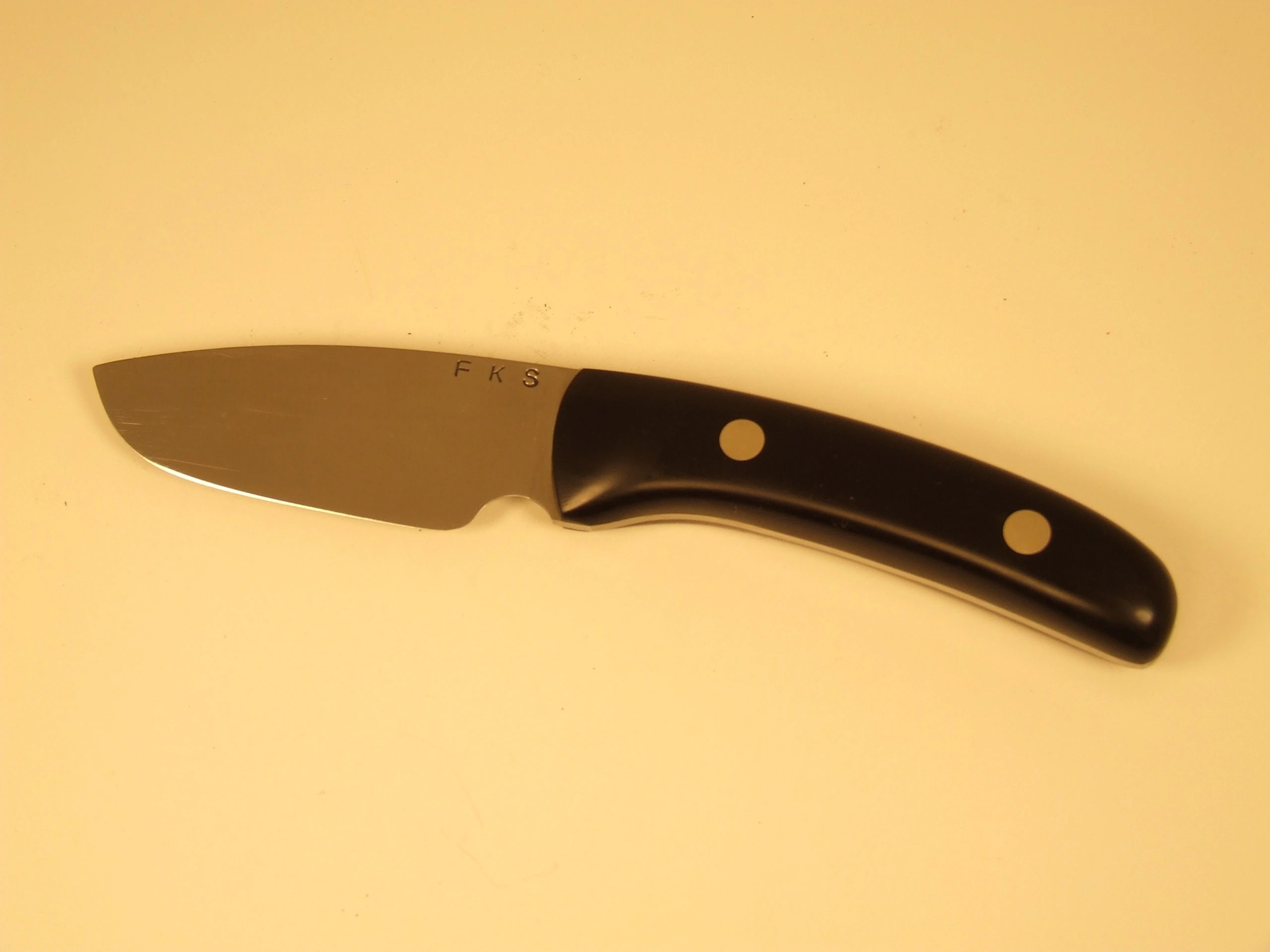 3 1/2" utility/camp knife, 1095 high carbon full tang blade with hard rubber grips and nickle silver rivets. SOLD